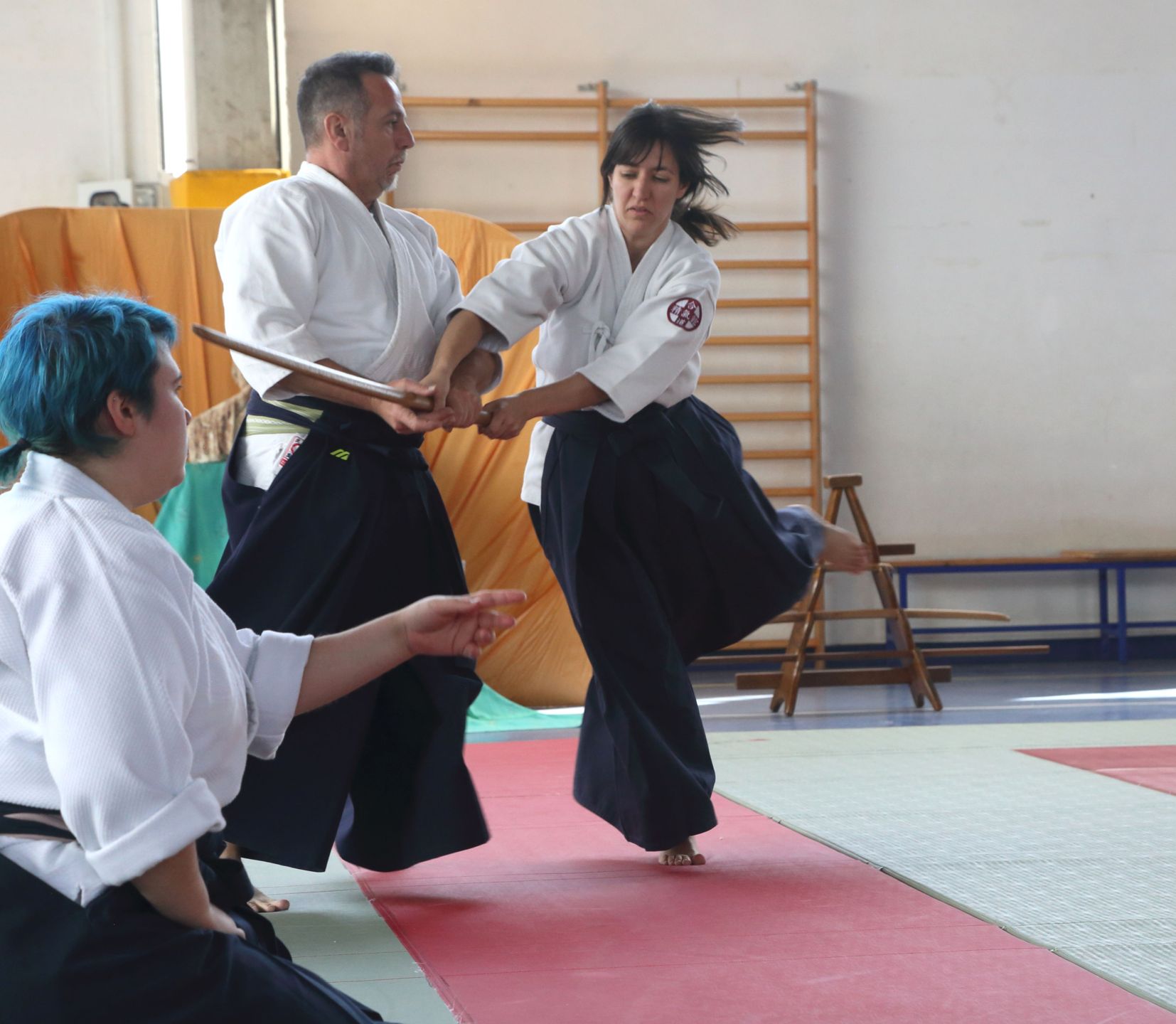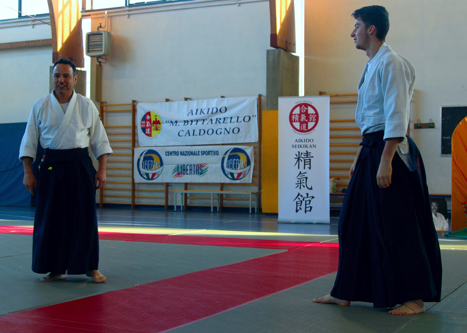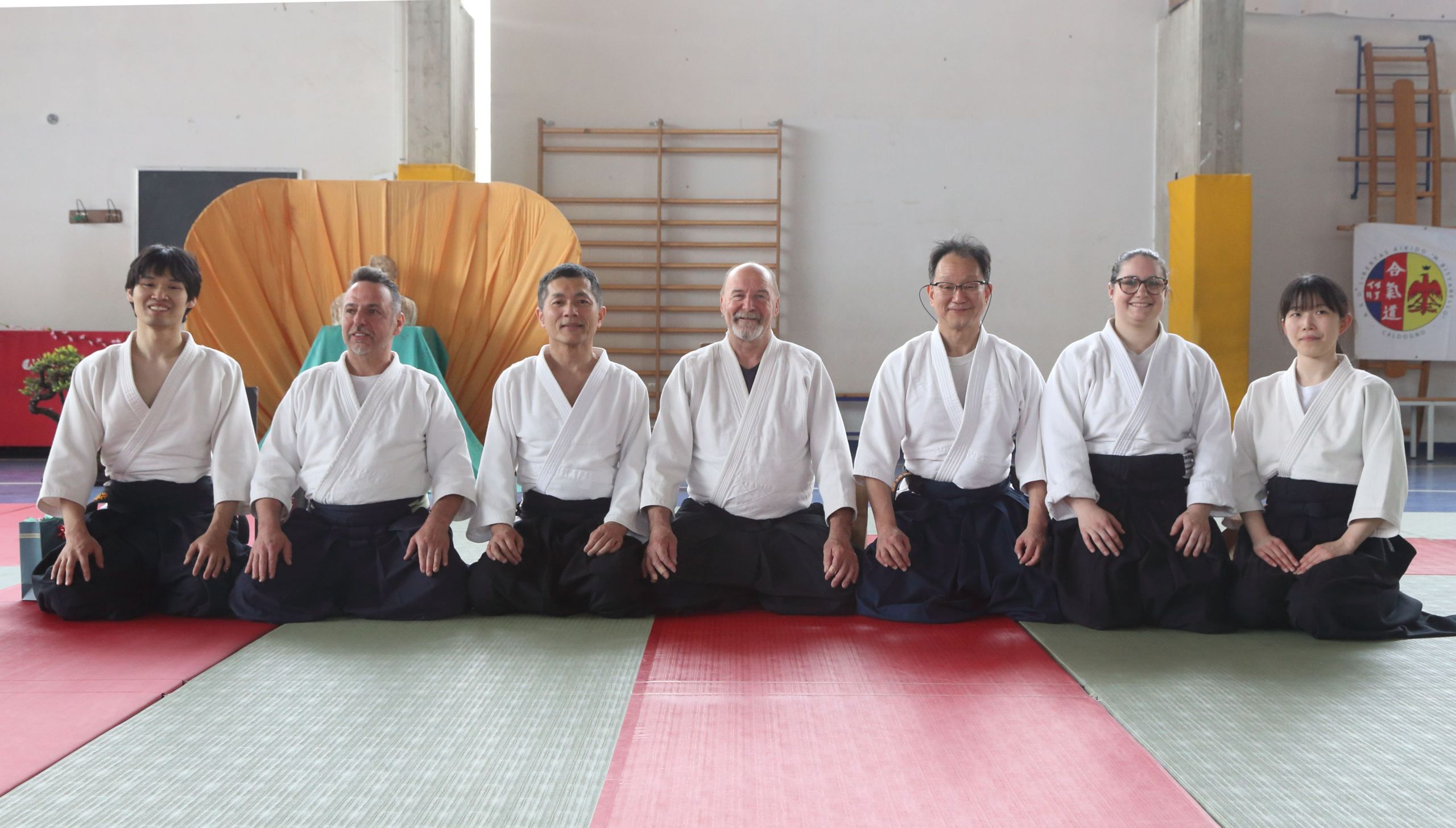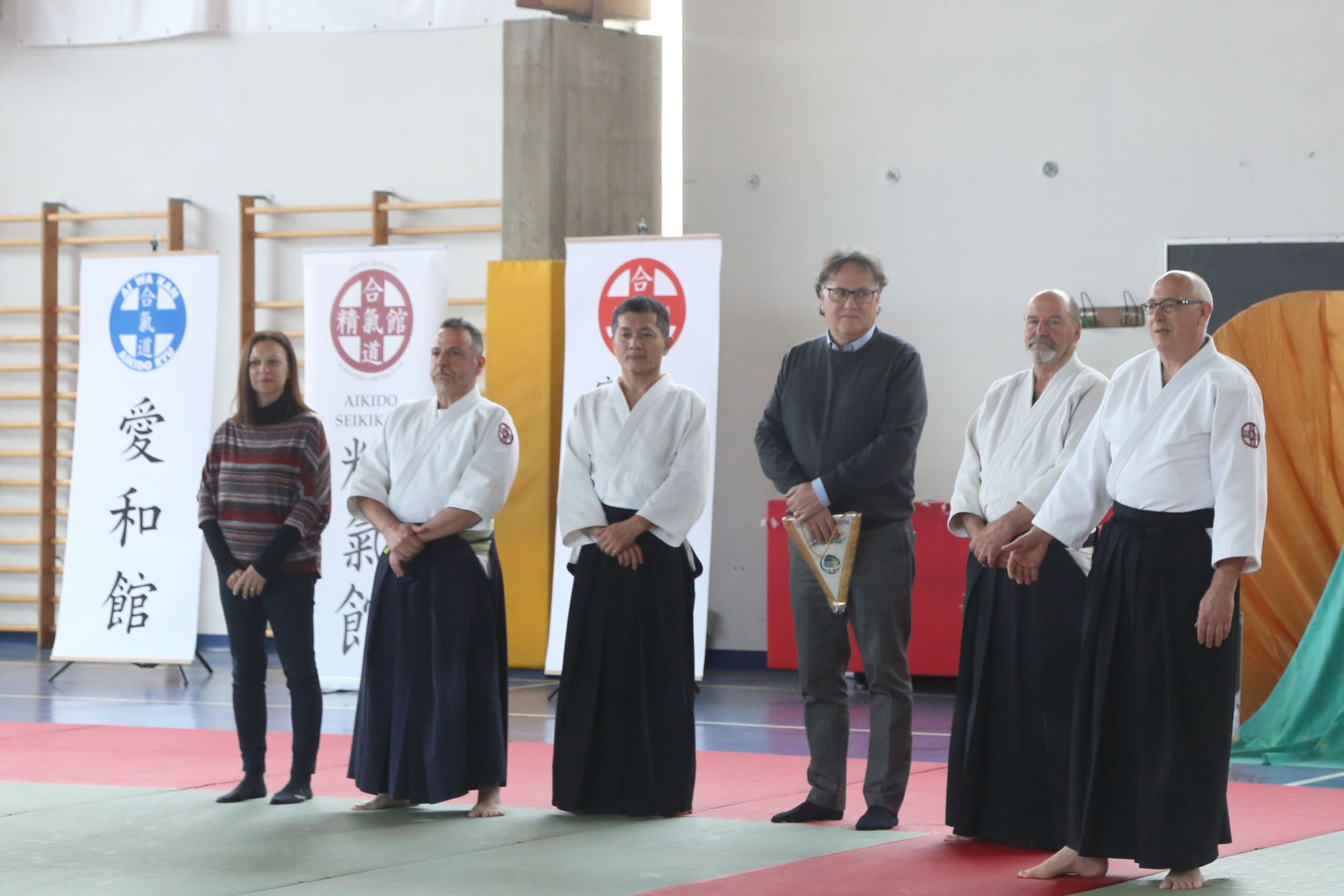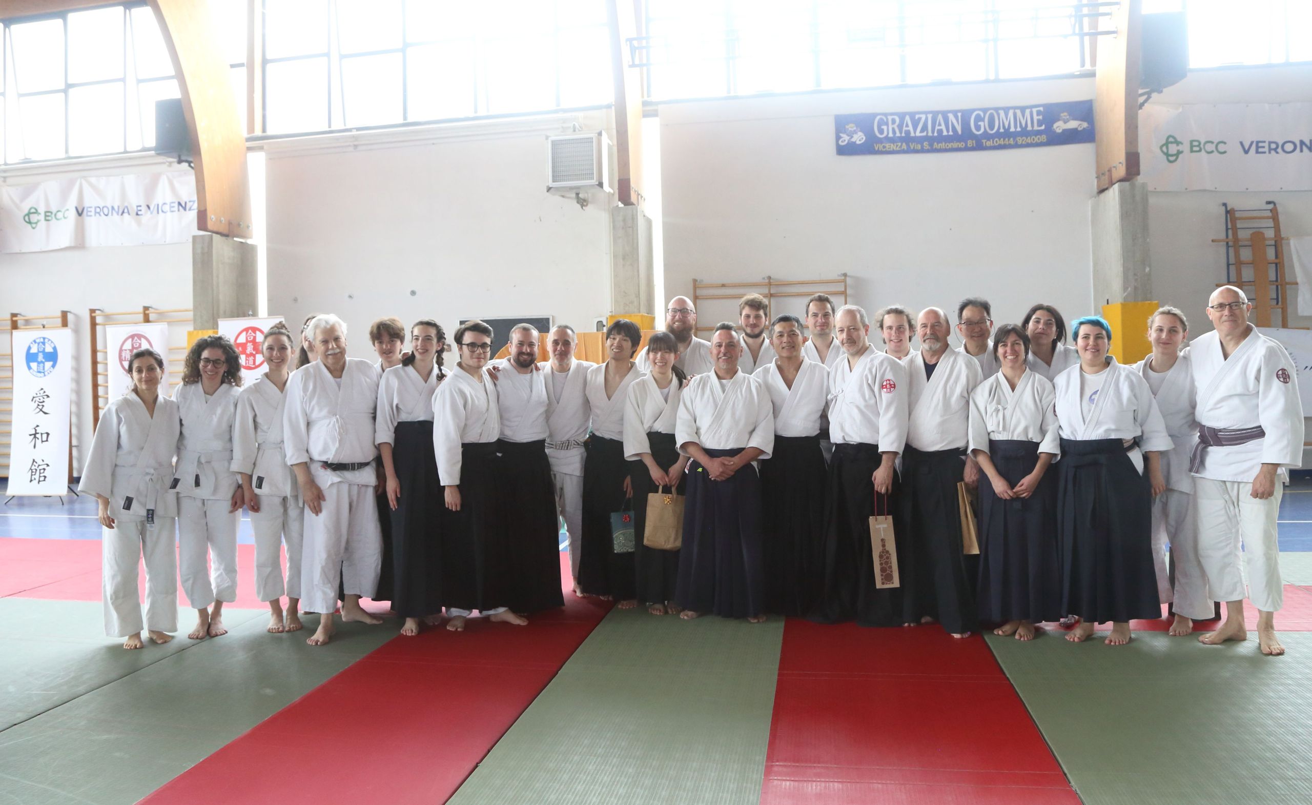 Tre Maestri che rappresentano lo stile del M° Hirokazu Kobayashi: M° Aldo Gonzato Shihan, M° Yuji Sato ospite dal Giappone e M° Paolo Tessaro a rappresentare la scuola di Aikido SeiKiKan di Caldogno.